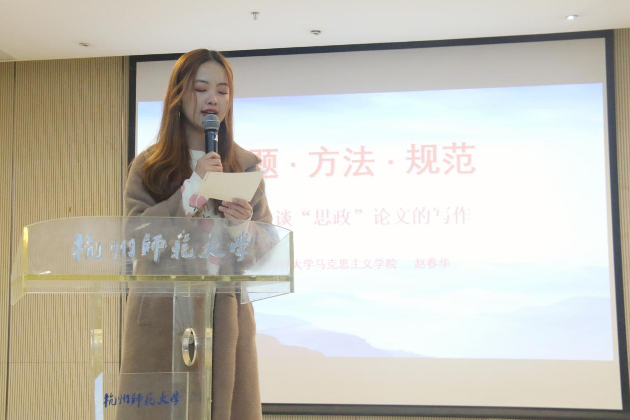 12月18日下午,马克思主义学院赵春华教授在恕园2号楼112教室应邀为我院学子作题为“选题·方法·规范”的思政论文写作辅导讲座。我院18级全体同学及院学生会全体干部参加此次讲座,讲座由院学生会主席陈麟主持。