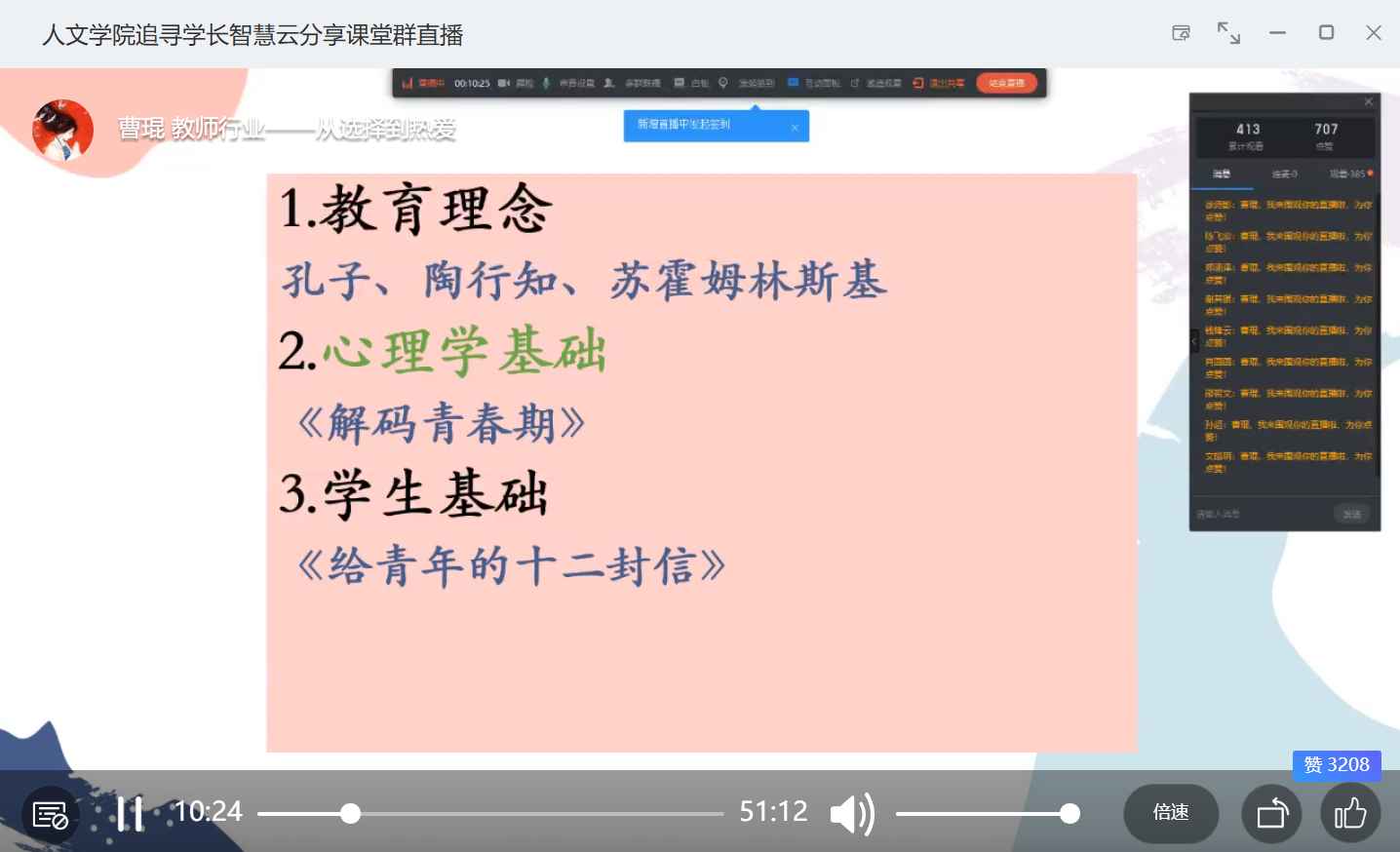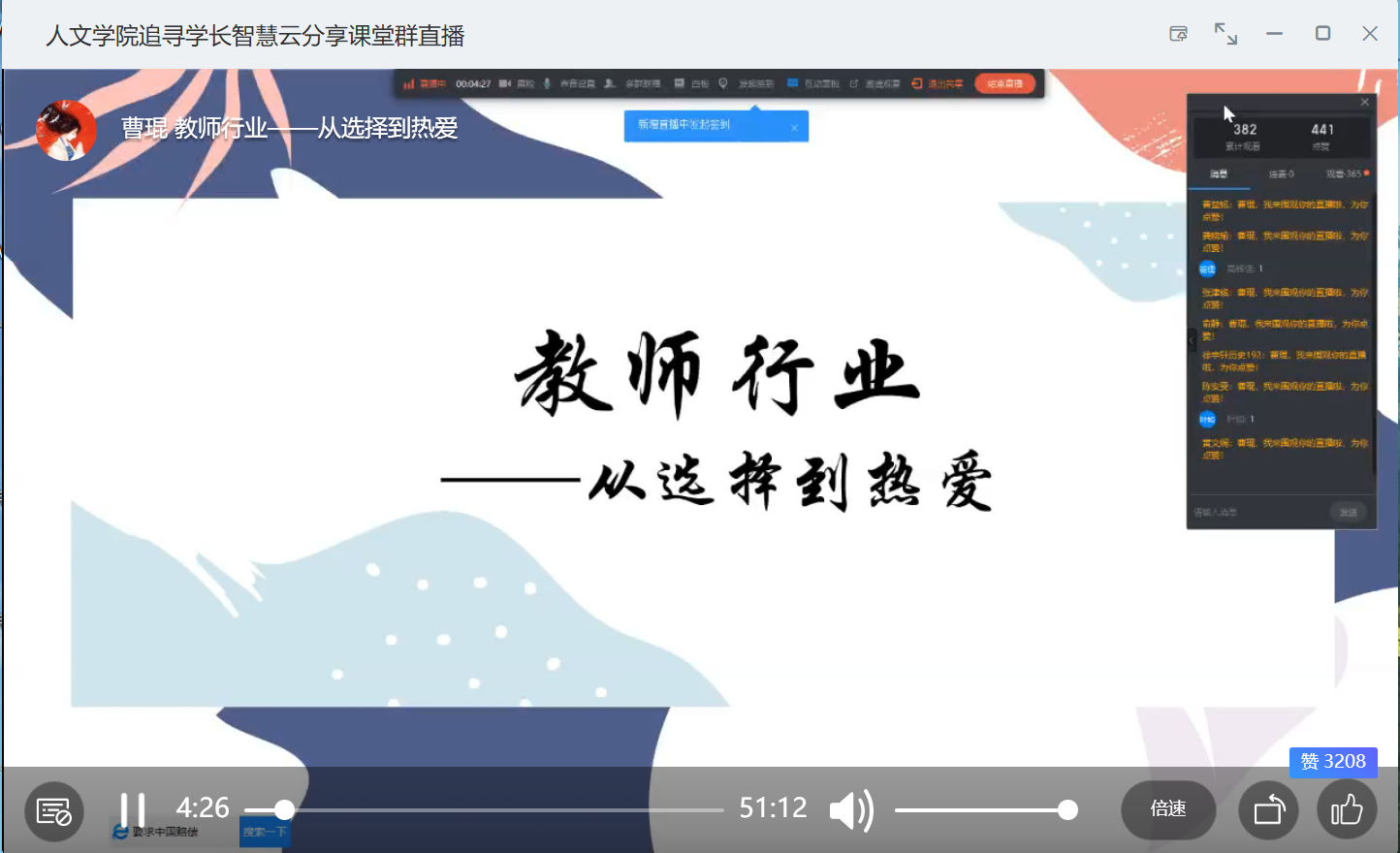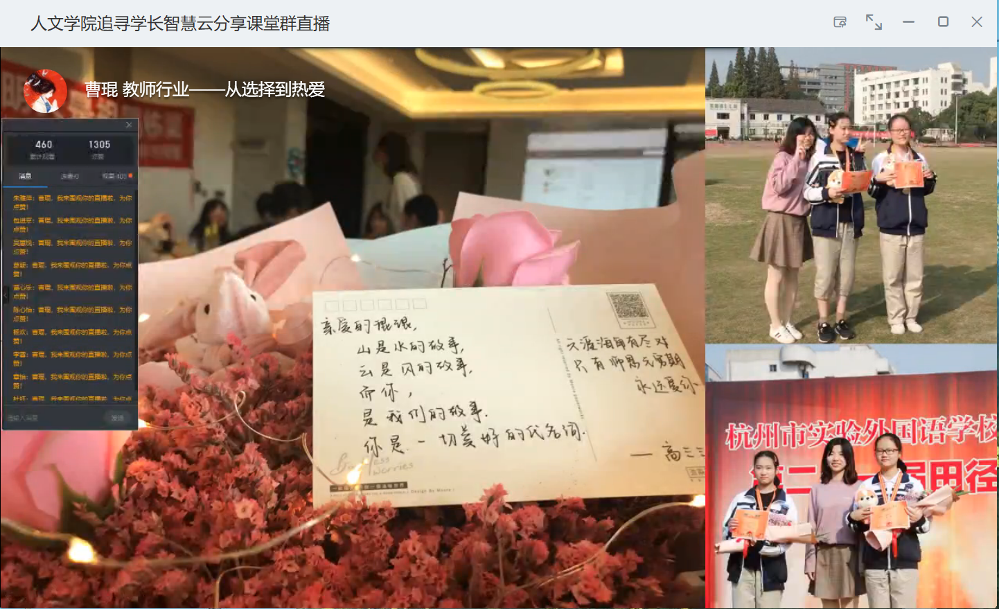 为庆祝学校办学112周年华诞,人文学院特举办一系列“校友月”活动,诚邀已毕业工作的优秀学长学姐为学弟学妹们传经送宝。5月13日晚7点,2016届校友、杭州市实验外国语学校曹琨学姐应邀作了题为“教师行业——从选择到热爱”的讲座,460余名同学在线参加。分享会由党委副书记管庆江主持。