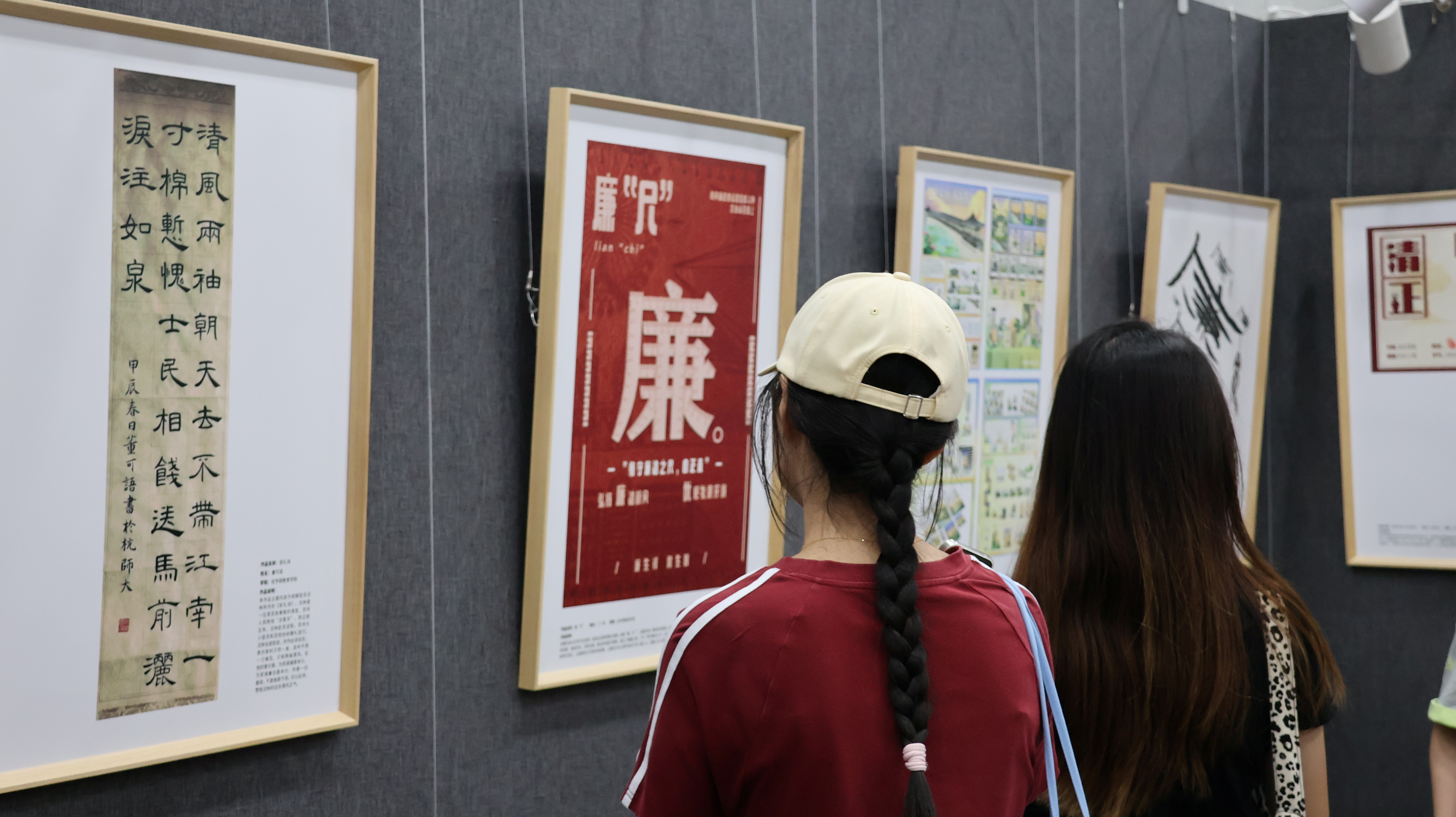 本次展览旨在通过艺术的形式传播廉洁理念。作品形式丰富多元,涵盖书法、设计与漫画等多种类型。书法作品或行云流水,或笔力遒劲,将廉洁精神融于笔墨之间,如“高山流水洁有情,清风明月廉无价”等金句。设计作品用色鲜明,巧妙融合“廉”与“腐”的元素,形成强烈视觉反差,警示我们始终要“兴廉政之风,树浩然正气”。漫画作品则通过尖锐直接的讽刺和通俗易懂的表达,让廉洁文化直抵人心。多样化的艺术形式不仅带来视觉震撼,也生动诠释了廉洁文化的内在精神与核心价值。