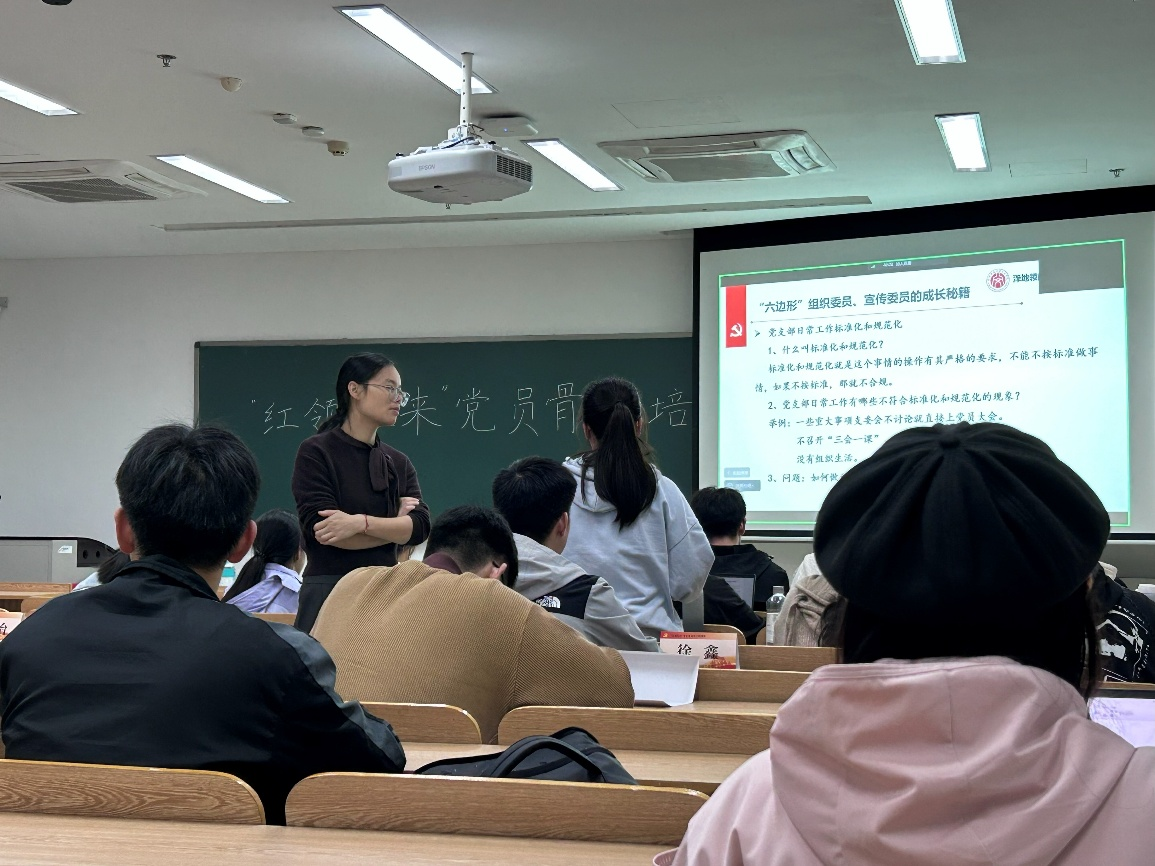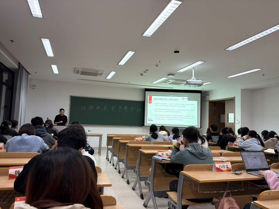 2025年11月9日晚,我校“红领先锋”学生党员骨干培训营第二讲在勤园6号楼409教室顺利举行。本期培训以“支委如何在支部工作中唱主角”为核心主题,人文学院专职组织员陈晓玲担任主讲,来自各学院的70余名学生党员骨干齐聚一堂,共同开启了一场关于角色、责任与担当的思想盛宴。