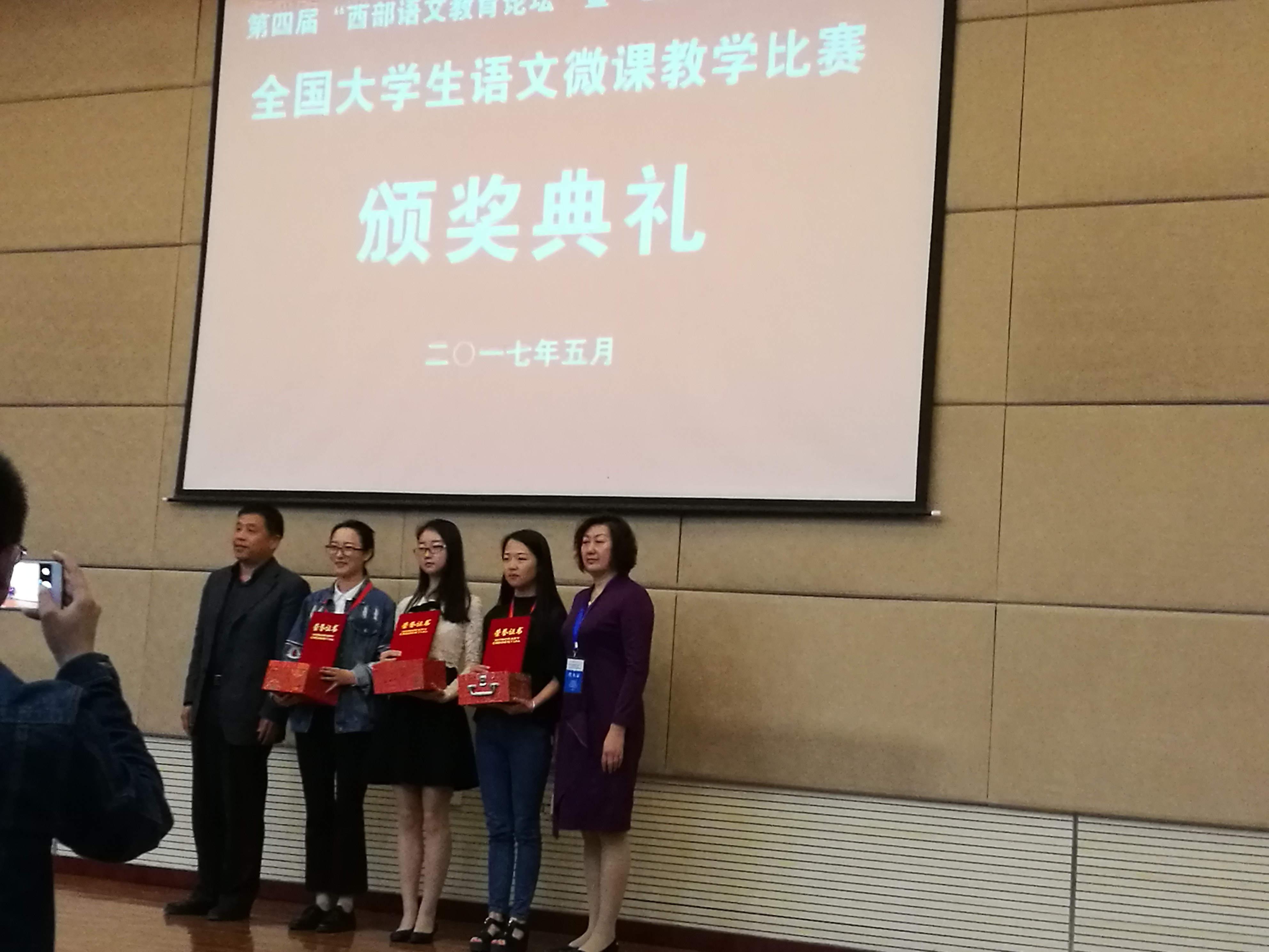 2017年5月6—8日,由中国高等教育学会语文教育专业委员会主办、陕西师范大学文学院承办的“第四届西部语文教育论坛:互联网+核心素养暨全国大学生语文微课教学风采展示活动”在陕西师范大学长安校区举行。来自北京师范大学、华东师范大学、东北师范大学、华南师范大学、苏州大学、湖北大学等全国40所高等院校的40名选手参加了微课教学展示活动,我院13级师范生教学技能精英班学员、中文系132班余雅君同学在叶黎明老师的精心指导下,把苏轼的代表作《定风波》上得从容大气,令人耳目一新的旧课导入、简明扼要的的板书设计、切中要害的文本分析,以及选手本人过硬的基本功,给在座的评委老师和观众留下深刻印象,获得一致好评。最终,余雅君同学在如林强手中脱颖而出,斩获特等奖。这是我院近三年来强化师范生技能培训结出的胜利果实。